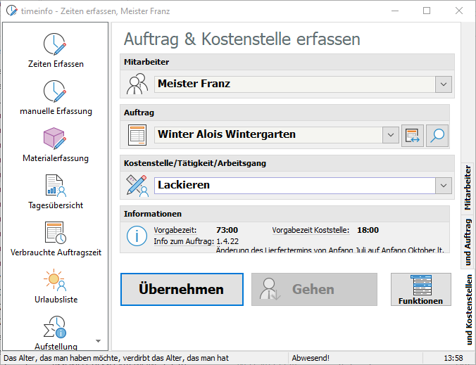 Neben der Zeiterfassung (dem Stempeln) der Mitarbeiter, auf Aufträge und Kostenstellen können die Mitarbeiter